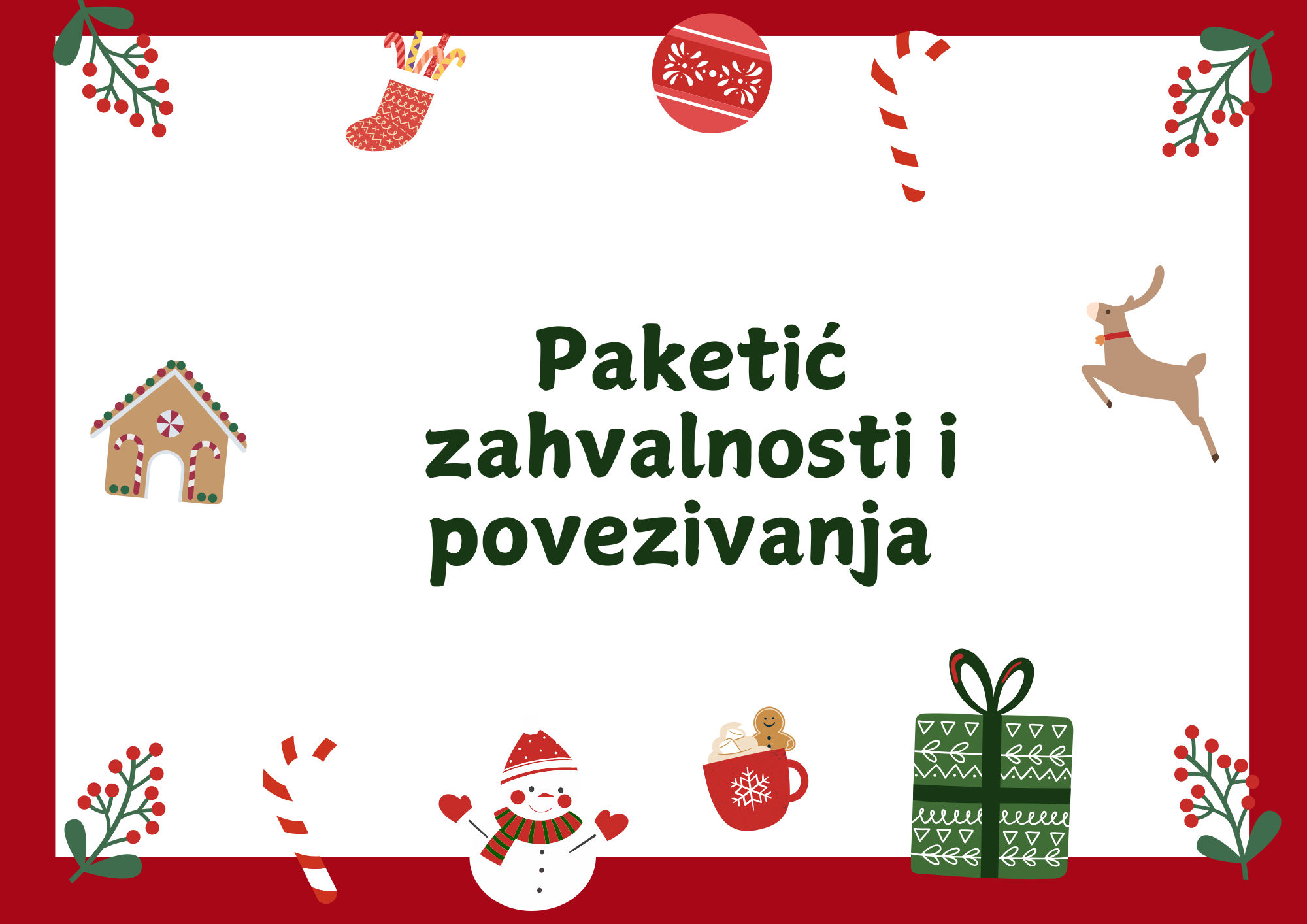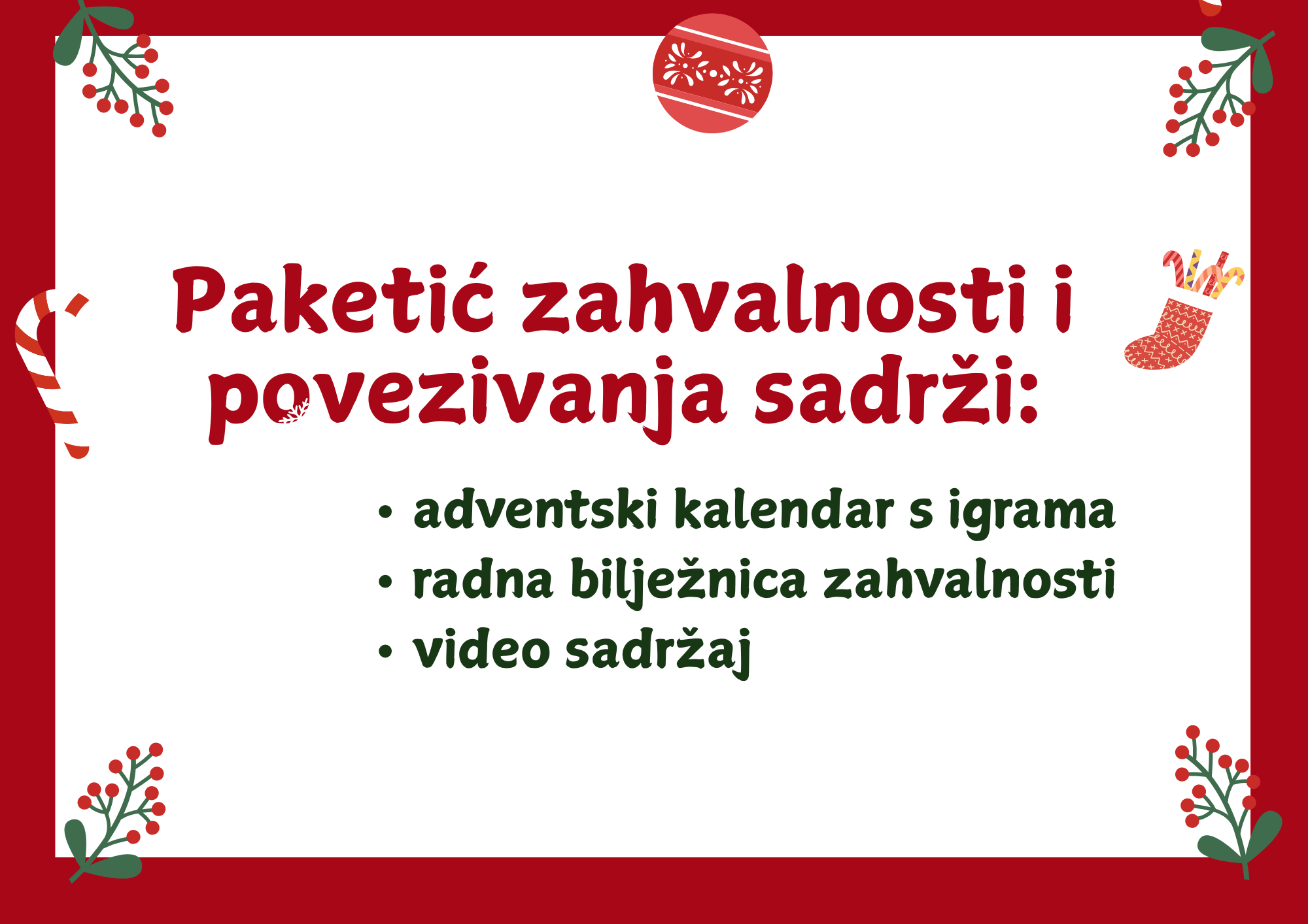 Ove godine poklonite svojoj djeci nešto što će pamtiti mnogo duže od čokoladica i igračaka. Poklonite im vrijeme. Pažnju. Ljubav. Zajedništvo. Poklonite im Paketić Zahvalnosti i Povezivanja – posebno osmišljen digitalni kalendar sa 24 dnevne aktivnosti koje bude toplinu, bliskost i radost u vašoj obitelji.
