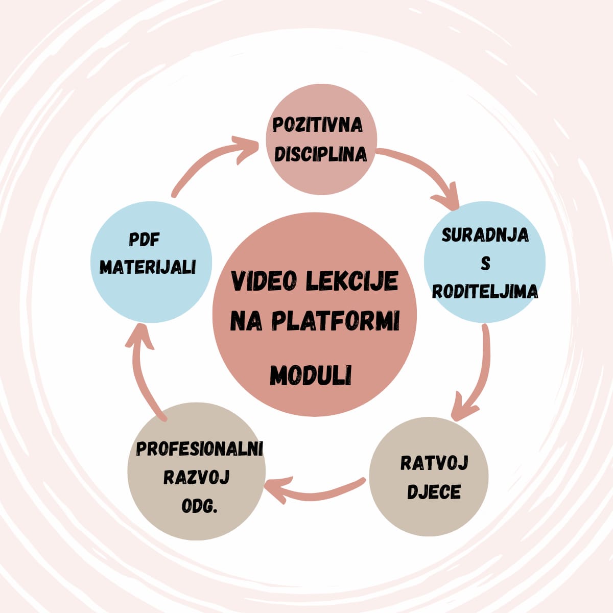 -4 modula kratkih video lekcija snimljenih u male formate za lakše konzumiranje + radni materijali. MODULI: •Disciplina u skupini: atmosfera, rituali, rješavanje sukoba, stvaranje dobre skupine, poštivanje pravila • Suradnja s roditeljima • Razvoj djeteta • Profesionalni I osobni identitet odgojitelja Moduli se nadopunjuju kroz cijelu godinu. -2× ZOOM DRUŽENJA MJESEČNO: podrška, razgovor, dijeljenje izazova, traženje rješenja, stvarna pitanja i odgovori - MJESEČNI BESPLATNI WEBINAR na određenu odgojiteljsku temu Cijena mjesečne pretplate je 30 eura Cijena za jednokratno plaćanje je 200 eura.